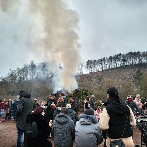 Doch bevor das Osterfeuer entzündet wurde, ließen wir uns eine frisch gebratene Bratwurst vor dem riesigen Haufen von Bäumen, Ästen und alten Tannenbäumen schmecken. Wir holten uns eine Bank, um uns gemütlich das Osterfeuer anzusehen. Gegen 19:00 Uhr wurde dann das Feuer von der Feuerwehr entzündet. Dies benötigte mehrere Versuche – nach einiger Zeit stieg Qualm auf und irgendwann konnten wir dann sogar Flammen sehen – plötzlich wurde es angenehm warm.