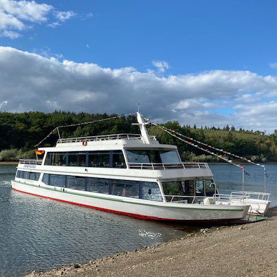Nach dem sportlichen Teil hieß es Schiff statt Büro: Gemeinsam haben wir uns mit der „Möwe“ von der Hauptanlegestelle am Sorpedamm zur Anlegestelle in Amecke fahren lassen und die Aussicht auf die Sorpe von der Wasserseite genossen. Die ruhige Wasseroberfläche, begleitet von vereinzelten Surfern, passte wunderbar zu den lockeren Gesprächen und Teammomenten.
