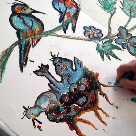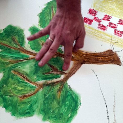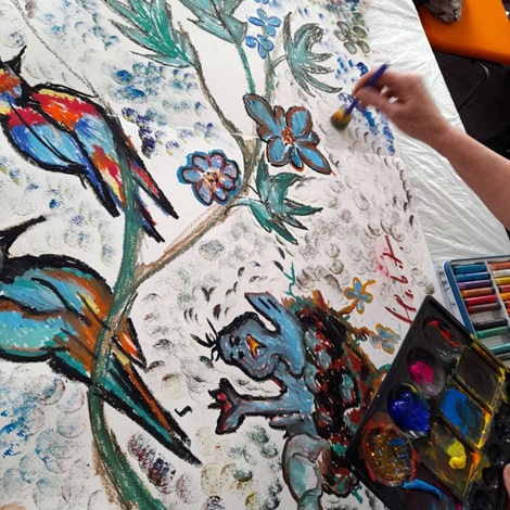 Thematisch wurde bei dem Erstellen dieses Bildes darauf geachtet, dass sich jeder in seinem Tempo individuell kreativ verwirklichen konnte. Das Bild schmückt jetzt eine Wand beim PST. Es wurden Acrylfarben und Ölkreiden verwendet.
